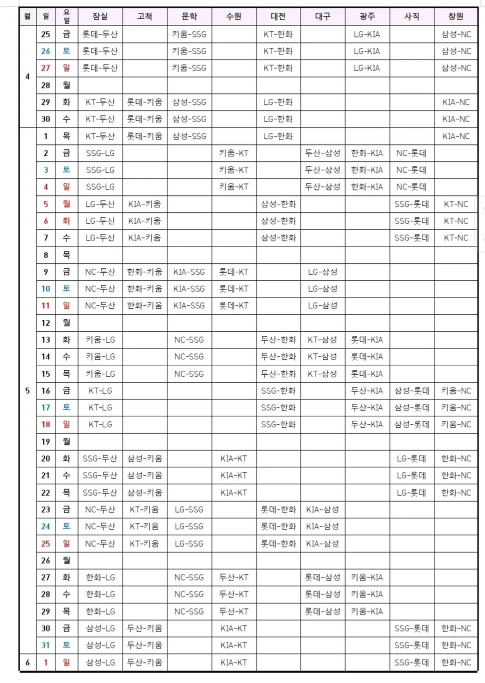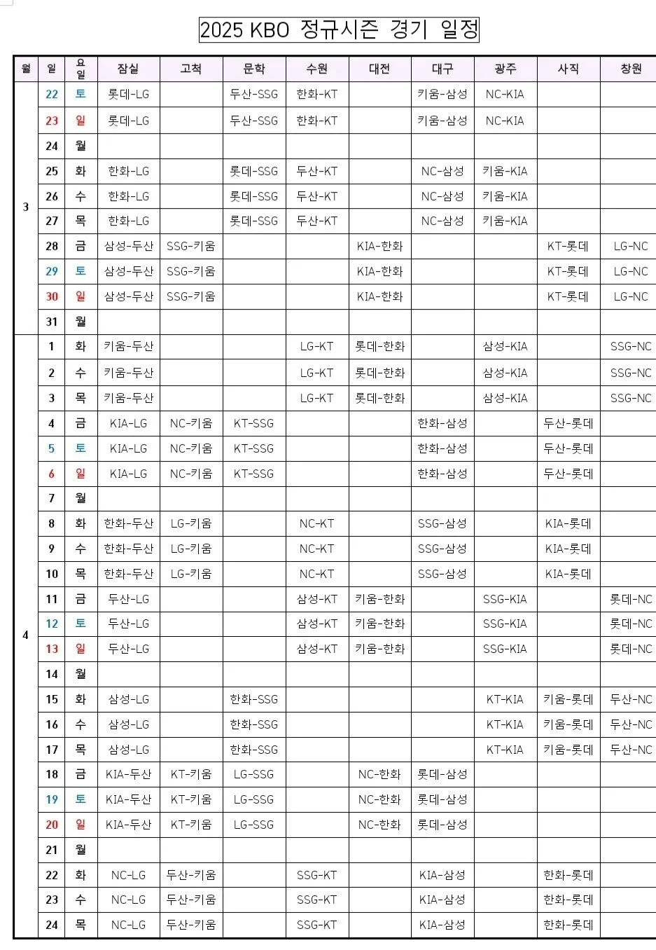 2025년 KBO 리그 정규시즌은 3월 22일부터 10월 초까지 진행되며, 각 팀은 총 144경기를 치릅니다. 팀별로 약 6개월간 숨 가쁘게 진행되는 이 일정은 시즌 막바지로 갈수록 치열한 순위 싸움을 예고하고 있습니다.
